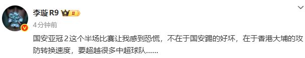 媒体人社媒发文热议国安1-2落后,李璇写道:“国安亚冠2这个半场比赛让我感到恐慌,不在于国安踢的好坏,在于香港大埔的攻防转换速度,要超越很多中超球队。”