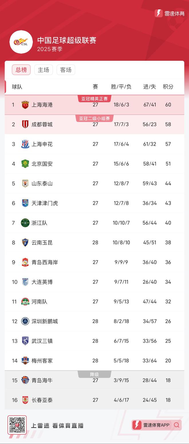 目前,深圳新鹏城和武汉三镇分别积26和25分,基本不必太担心保级形势。但梅州客家十分被动,多赛一场积20分暂列倒数第三,身后少赛一场的青岛海牛和长春亚泰同积18分,两队有望在本轮超越梅州。