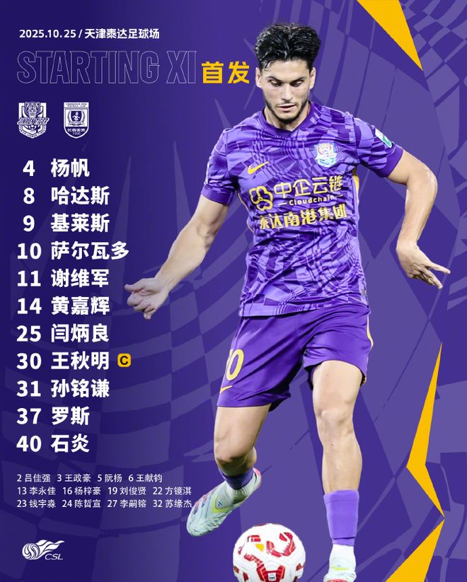 本场比赛,津门虎继续541阵型。门将闫炳良;杨帆、胡安·罗斯、谢维军搭档三中卫,孙铭谦、石炎分居左右;四名中场是王秋明、萨尔瓦多、黄嘉辉、哈达斯;解禁复出的基莱斯担任中锋。巴顿、阿代米继续因伤缺席。