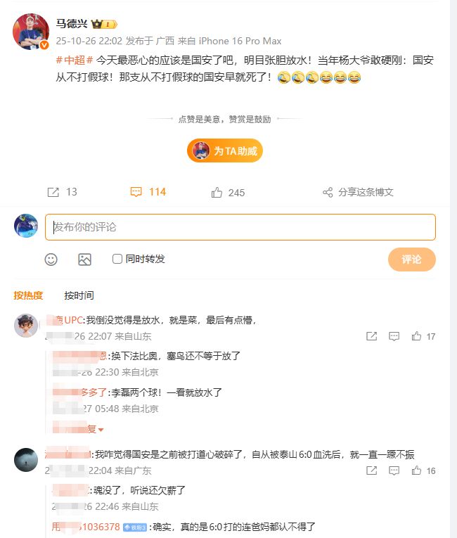 比赛结束之后,马德兴发文“今天最恶心的应该是北京国安了吧?明目张胆防水。”如果单纯的说北京国安放水倒也没什么,但是,接下来马德兴的话就比较重了。“当年杨大爷敢硬刚:国安从不打假球!那支从不打假球的国安早就死了”。意思很明显,2:4输给青岛海牛,马德兴就认为北京国安是在打假球。