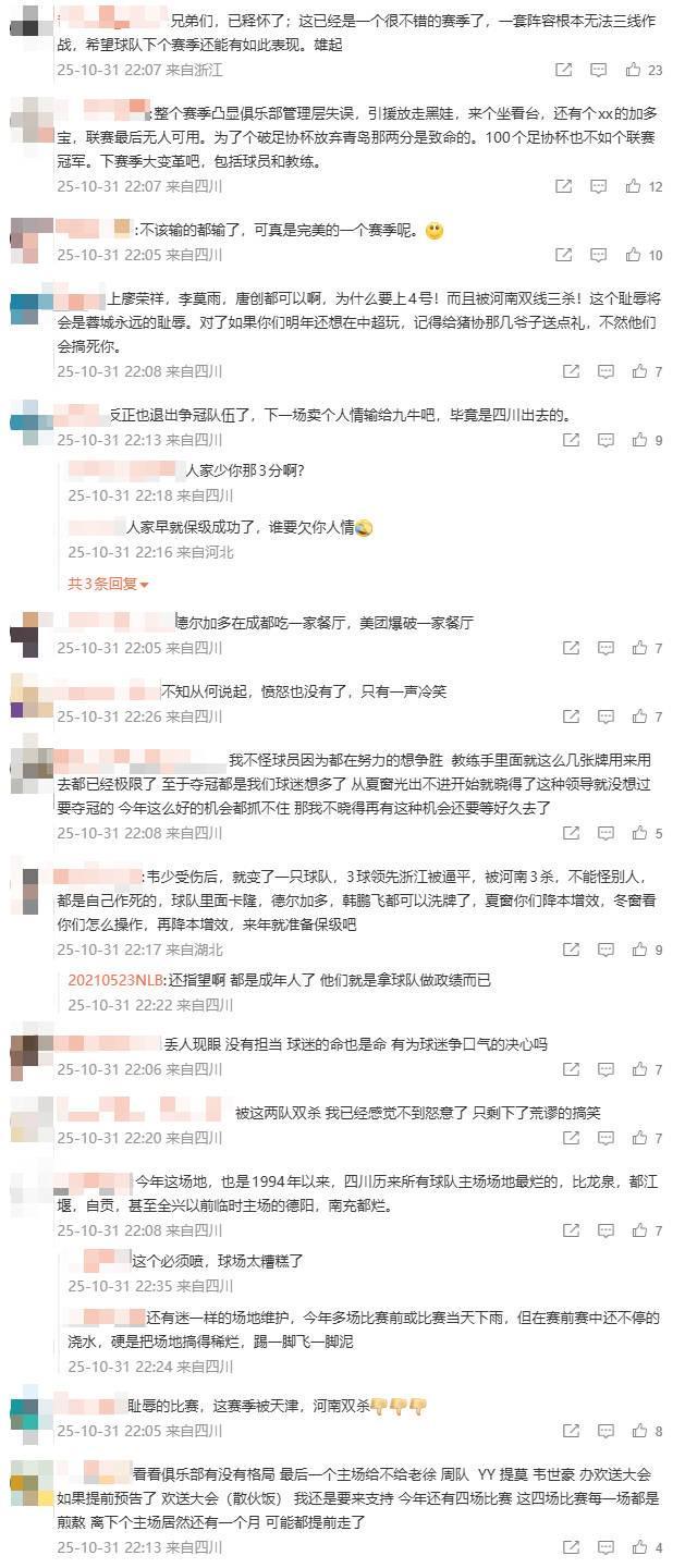 比赛结束后,成都蓉城官微发布了本场比赛的战报,并向球迷表示感谢,其中写道:“衷心感谢今晚来到主场、为蓉城将士们呐喊助威的41242位球迷家人们!终场哨响,热血未凉。”“2025赛季的中超征程即将行至终章,243天的拼搏与汗水,29轮联赛的跌宕起伏,成都蓉城用一场场激战,在赛场上镌刻下热血、坚守与永不言弃的蓉城精神。”“感谢所有蓉城将士的倾力付出,感谢看台上始终相伴的球迷家人们,你们的呐喊赋予我们所有向前的勇气。赢了一起狂,输了一起扛,未来的挑战,我们共同迎接。让我们集结所有的信念与力量,为了下一场比赛坚定出征!”不过在这条动态下,许多球迷表达了对球队表现的不满,有人评论“失望”、“意难平”、“降本增笑”、“你们配不上成都这座城市和球迷,一次又一次往伤口撒盐”等,当然,也不乏一些鼓励的评论,如“希望下赛季还有这样的表现”、“下赛季加油”等。