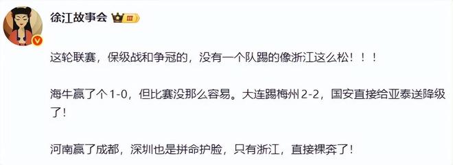 另一位媒体人徐江则将“矛头”指向上海海港主场对阵浙江的比赛。这场比赛海港3球完胜浙江,徐江认为浙江的表现过于放松。“这轮联赛,保级战和争冠的,没有一个队踢的像浙江这么松!海牛赢了个1-0,但比赛没那么容易。大连踢梅州2-2,国安直接给亚泰送降级了!河南赢了成都,深圳也是拼命护脸,只有浙江,直接裸奔了!”徐江声称。