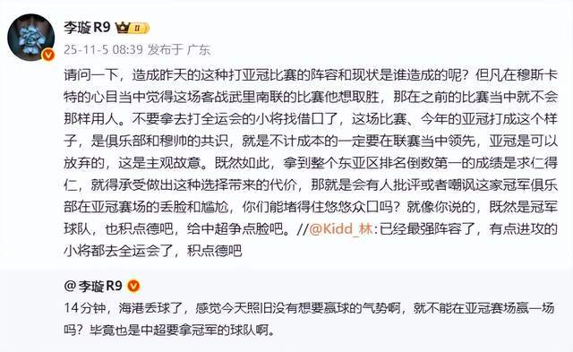 有球迷表示,上海海港“已经最强阵容了,有点进攻的小将都去全运会了,积点德吧。”对此,李璇老师表示,“请问一下,造成昨天的这种打亚冠比赛的阵容和现状是谁造成的呢?但凡在穆斯卡特的心目当中觉得这场客战武里南联的比赛他想取胜,那在之前的比赛当中就不会那样用人。不要拿去打全运会的小将找借口了,这场比赛、今年的亚冠打成这个样子,是俱乐部和穆帅的共识,就是不计成本的一定要在联赛当中领先,亚冠是可以放弃的,这是主观故意。既然如此,拿到整个东亚区排名倒数第一的成绩是求仁得仁,就得承受做出这种选择带来的代价,那就是会有人批评或者嘲讽这家冠军俱乐部在亚冠赛场的丢脸和尴尬,你们能堵得住悠悠众口吗?就像你说的,既然是冠军球队,也积点德吧,给中超争点脸吧。”
