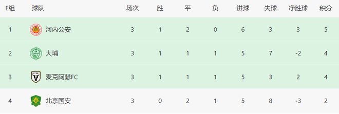 对手大埔虽然是一支名不见经传的中国香港球队,但却在前面3轮表现不俗,取得1胜1平1负积4分的战绩,目前排在该小组的第2名。双方首回合比赛,北京国安在客场3:3战平大埔,本轮如果国安能够在主场拿下大埔,就可反超他们摆脱积分垫底的尴尬。