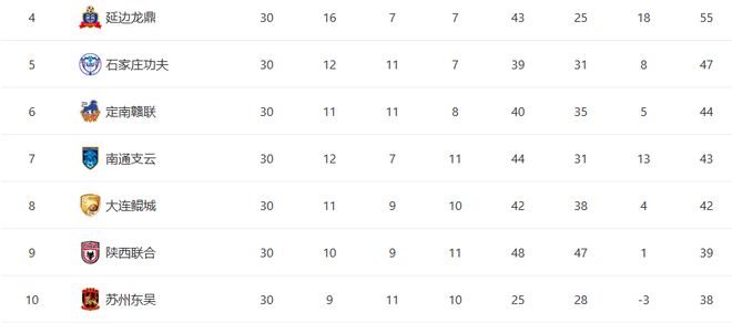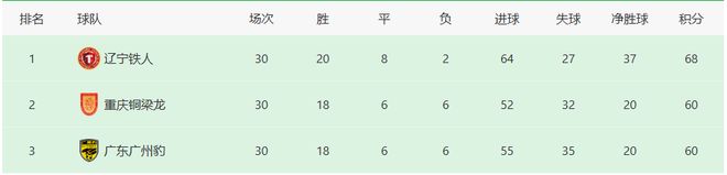 最后让我们再来看一下本赛季中甲最终的积分榜情况。辽宁以68分成功拿到中甲冠军,晋级到中超;重庆和广州都是60分,前者以更少丢球成功携手辽宁实现晋级。