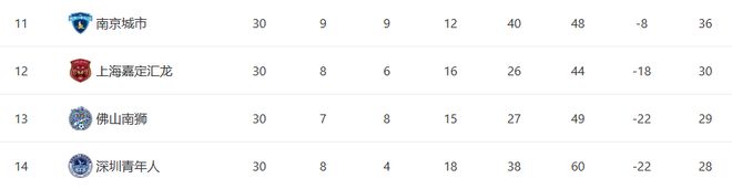 排在11—14名的队伍:南京:36分;上海30分;佛山29分;深圳28分