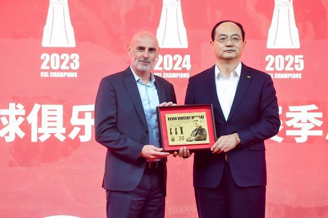 上港集团党委副书记、总裁宋晓东向主教练穆斯卡特赠送特别定制的竹刻画像,画像中镌刻着穆帅的形象、熠熠生辉的冠军奖杯及俱乐部二十周年纪念标识,以此表彰其两个赛季率队连夺冠军的卓越贡献。