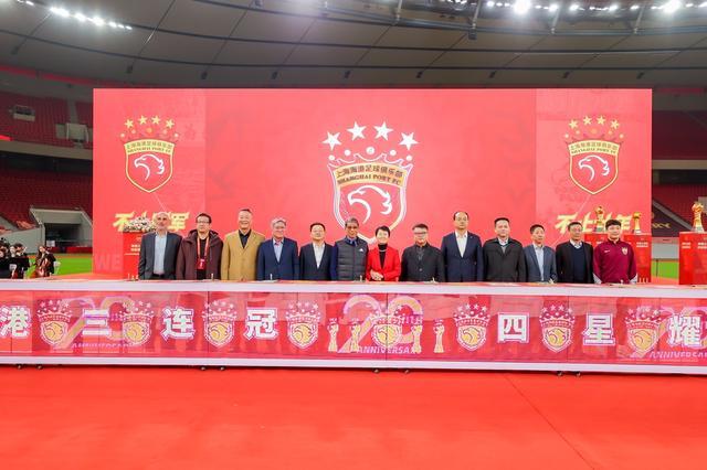会议尾声,上海市人民政府副秘书长周亚明向上港集团副总裁、上海海港足球俱乐部董事长张敏赠送刻有“不止冠军、不止廿年”的木雕雄鹰,激励俱乐部振翅高飞、勇攀新高。上海市副市长解冬为队长王燊超送上定制冠军奖杯刺绣,寄望海港队未来再创佳绩。随后,领导嘉宾们在主题卷轴上共同盖章为队徽添星,全体与会人员共同见证这一意义非凡的时刻。二十载风雨兼程,四星荣耀既是里程碑也是新起点,未来上海海港将以更昂扬的面貌深耕足球事业,为中国足球发展注入海港力量。