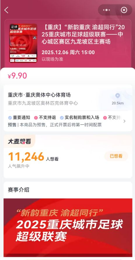重回奥体看球带热了九龙坡首个主场的球票。“渝超”官网截图重庆球迷重回奥体的热情,在球票销售上得到了体现。记者从“渝超”组委会获悉,截至12月1日15点30分,九龙鑫源熊猫队VS沙坪坝陈昌银队的“渝超”球票预售仅过了半小时,就售出了32000张门票,本场比赛的抢票热度超过了“渝超”揭幕战。12月1日,记者还和黄希扬聊起了重回奥体看“渝超”的话题。对于当年在奥体中心梅开二度的高光时刻,他仍然记忆犹新:“这场球肯定忘不了,当时我梅开二度,赢的还是领头羊。”不过略显遗憾的是,因为黄希扬目前正在外地参加A级教练员培训,所以12月6日无法回到重庆奥体中心重温昔日的激情了:“只有下次再找机会回奥体看球了。”上游新闻记者 赵映骥