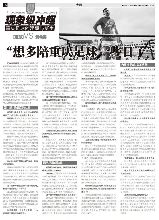 ◆《足球》:有没有想过在中超赛场上再踢一踢?黄希扬:现在还没考虑那么多,这还需要跟俱乐部进一步沟通。因为我心愿已经达成了,如果球队还需要我,我就会义不容辞地站出来。◆今年是新投资人进驻的第一年,你们磨合得怎么样?共同冲超的过程中,我们的磨合很顺畅。不管是日常接触还是冬训期间的相处,都能感受到新团队的专业性,老板、李平总等核心成员都是深耕足球圈几十年的人,既懂球又有丰富的行业经验,在俱乐部管理、运营等各个方面都展现出了足够的专业度和职业素养,和这样的团队合作很省心,也更有底气。◆新时期的铜梁龙,你觉得最让人期待的是什么?一是希望队里能涌现出更多有实力的球员,未来有机会入选国家队,这是我职业生涯的遗憾,所以格外期盼年轻队员能圆这个梦;二是期待更多球员能在中超舞台上充分展现自己,这份成长与突破值得期待。三是最核心的,希望俱乐部能实现长远稳定发展。我曾经历过球队解散的痛苦,深知只有球队立足于这座城市,和城市的足球底蕴结合才能长久稳定地发展,支持我们的球迷也不会失去归宿,这才是一切期待的基础。