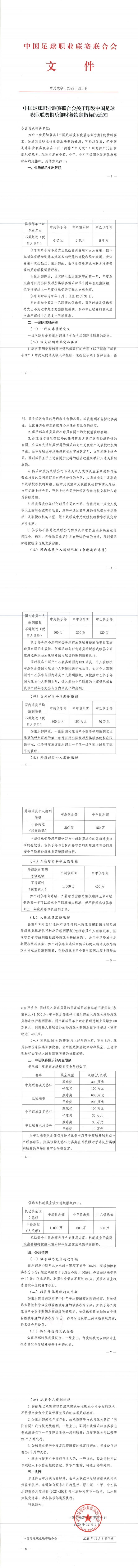来源:财联社财联社12月3日讯,中国足球职业联赛联合会3日发布《中国足球职业联赛联合会关于印发中国足球职业联赛俱乐部财务约定指标的通知》,对职业俱乐部一线队球员薪资做出限额规定。其中,一线队球员是指俱乐部报名参加各级别职业联赛的球员。《通知》规定:国内球员年薪限额分别不得超过500万元(中超俱乐部)、300万(中甲俱乐部)和120万(中乙俱乐部);国内球员平均薪酬分别不得超过300万(中超俱乐部)、150万(中甲俱乐部)和50万(中乙俱乐部);外籍球员个人薪酬限额分别不得超过300万欧元(中超俱乐部)和150万欧元(中甲俱乐部)。另外,《通知》还公布了中超联赛俱乐部奖金限额,亚冠联赛单场赢球奖金限额为600万元,中超联赛及足协杯单场赢球奖金限额为300万元。