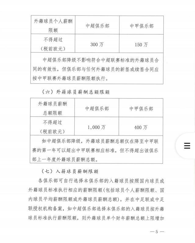 据足球报报道,12月3日下午,中足联发布《中国足球职业联赛俱乐部财务约定指标》,对职业俱乐部一线队球员薪资做出了详细规定:中超俱乐部国内球员个人薪酬不得超过500万元(税前),中甲国内球员个人薪酬不得超过300万元(税前),中乙国内球员个人薪酬不得超过120万。中超俱乐部外援个人薪酬不得超过300万欧元(税前),中甲俱乐部外援个人薪酬不得超过150万欧元(税前)。中超俱乐部外援薪酬总额不得超过1000万欧元(税前),中甲俱乐部外援薪酬总额不得超过400万欧元(税前)。中超俱乐部国内球员平均薪酬限额不得超过500万元(税前),中甲国内球员平均薪酬限额不得超过300万元(税前),中乙国内球员平均薪酬限额不得超过50万元(税前)。至于入籍球员,各俱乐部可自行选择本俱乐部的入籍球员按照国内球员或外籍球员标准执行相应的薪酬限额(包括球员个人薪酬限额、国内球员平均薪酬限额或外籍球员薪酬总额),并在中足联或中足联授权机构备案,如中超俱乐部选择本俱乐部的入籍球员按外籍球员标准执行薪酬限额,则外籍球员单个财年薪酬总额上限增加200万欧元,同时除入籍球员外的外籍球员薪酬总额不得超过(税前欧元)1.000万:中甲俱乐部选择本俱乐部的入籍球员按外籍球员标准执行薪酬限额,则外籍球员单个财年薪酬总额上限增加80万欧元,同时除入籍球员外的外籍球员薪酬总额不得超过(税前欧元)400万。