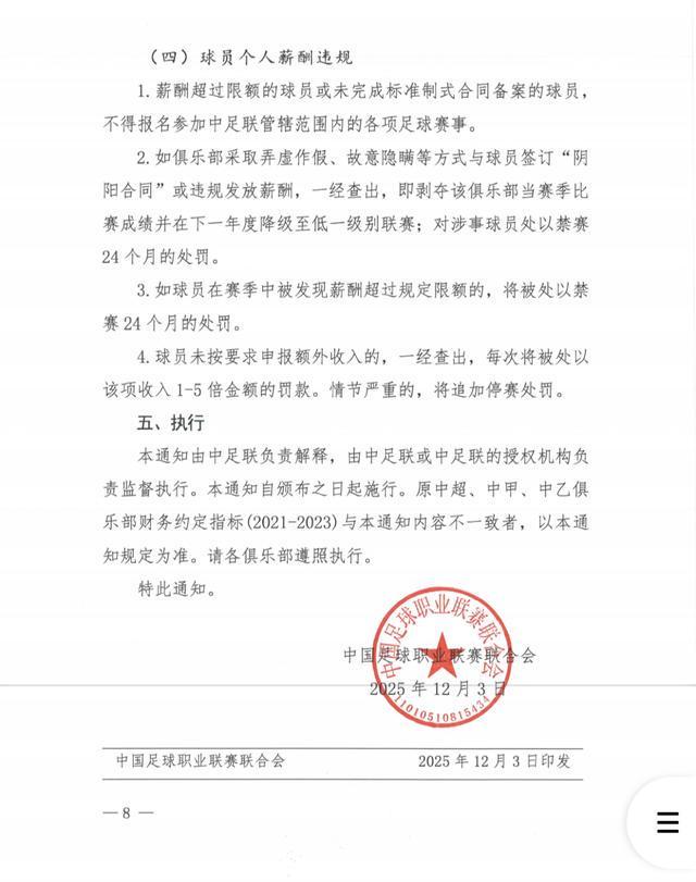中足联:中超年支出不超过6亿、国内球员限薪500万、阴阳合同将被罚降级