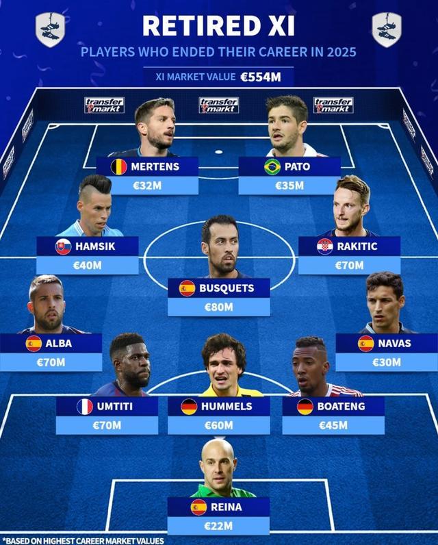 德转列2025年退役球员最佳11人(括号内为生涯德转最高身价):门将雷纳(2200万欧元)后卫赫苏斯-纳瓦斯(3000万欧元)、热罗姆-博阿滕(4500万欧元)、胡梅尔斯(6000万欧元)、乌姆蒂蒂(7000万欧元)、阿尔巴(7000万欧元)中场拉基蒂奇(7000万欧元)、布斯克茨(8000万欧元)、哈姆西克(4000万欧元)前锋帕托(3500万欧元)、梅尔滕斯(3200万欧元)【上咪咕独家看