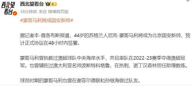 体坛周报记者王晓瑞也更新了最新的进展,表示蒙哥马利已经跟北京国安谈妥合同,达成执教意向。之所以还没有签约,是因为在“走流程、等批复”。